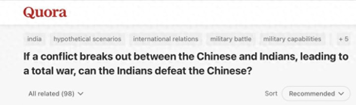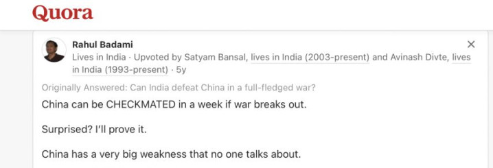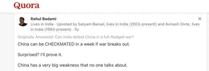 Quora的深夜,一条回答在南亚网民中疯狂转发。印度网友Rahul Badami敲下了那行让人血脉贲张的结论:“如果中印开战,中国会在一周内被将死。”
